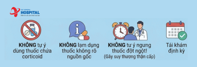 - Không tự ý ngưng thuốc Corticoid, ngưng đột ngột có thể gây suy tuyến thượng thận cấp, rất nguy hiểm.