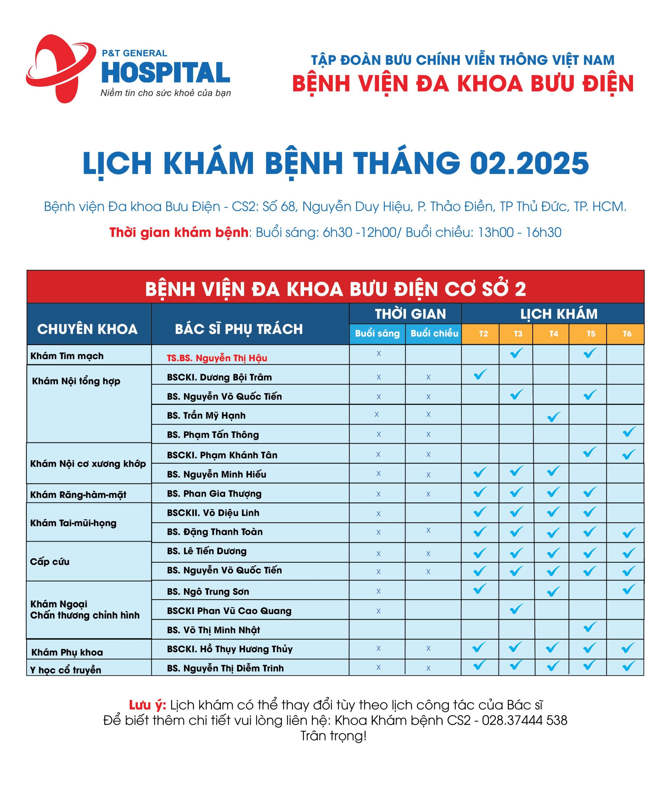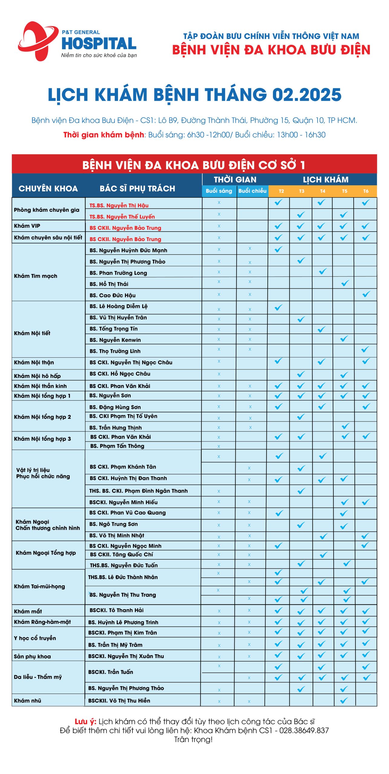 Bệnh viện Đa Khoa Bưu Điện cập nhật lịch khám bệnh Tháng 02 – 2025:
