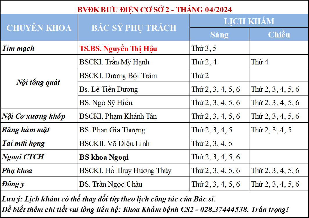 LỊCH KHÁM BỆNH THÁNG 04 – 2024