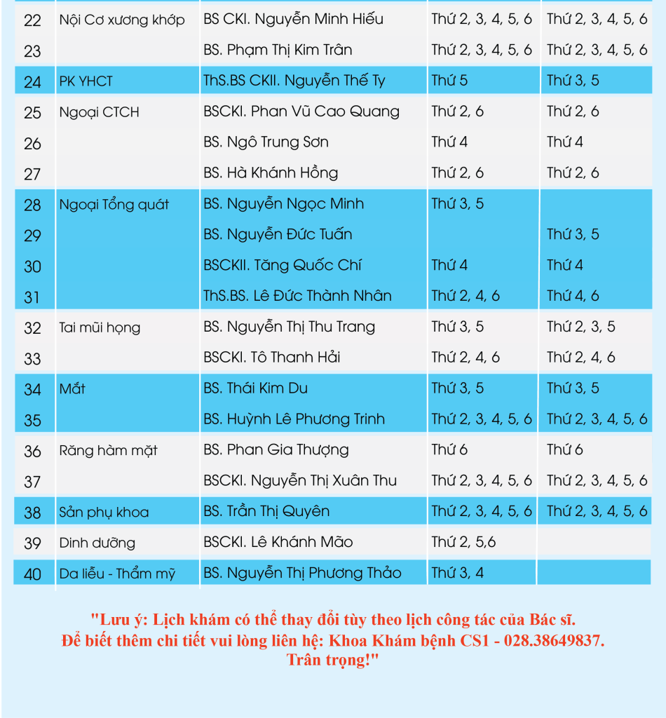 LỊCH KHÁM BỆNH THÁNG 07-2024