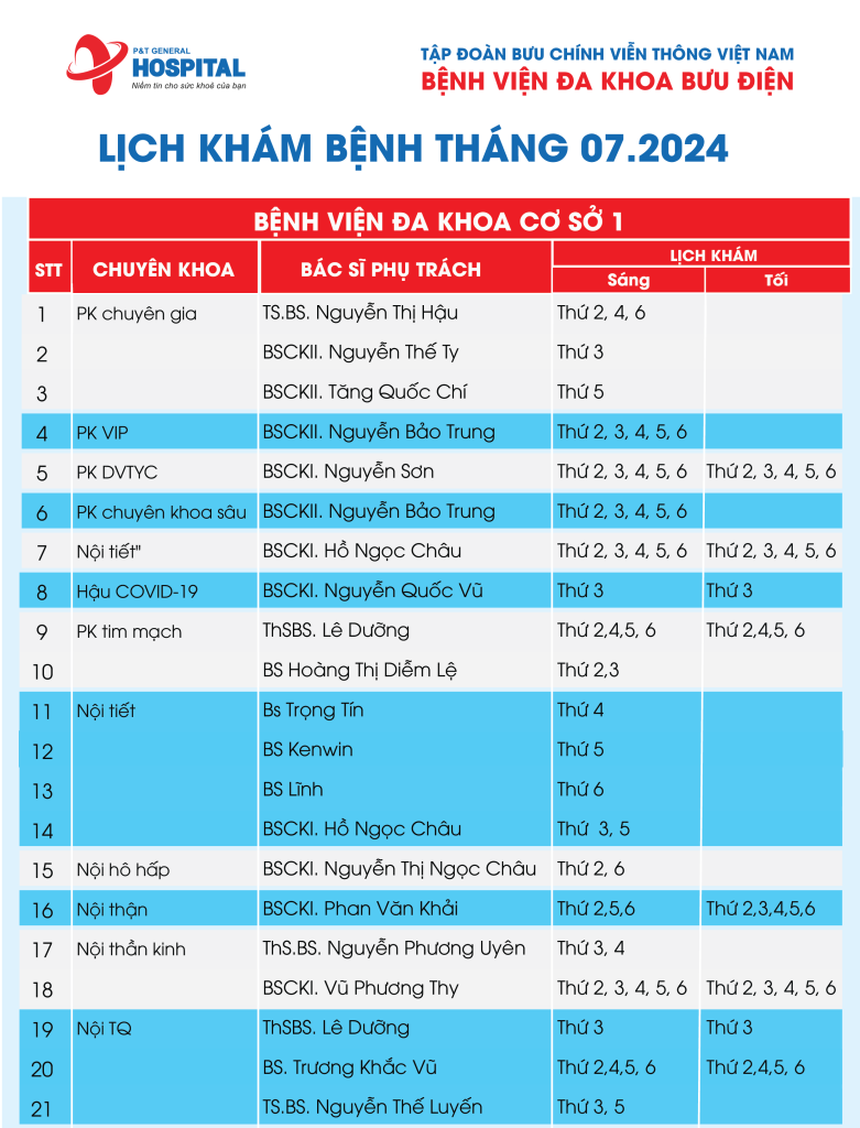 Mời bạn cập nhật ngay Lịch khám bệnh Tháng 07/2024 của Bệnh viện Đa khoa Bưu Điện ngay bên dưới đây.