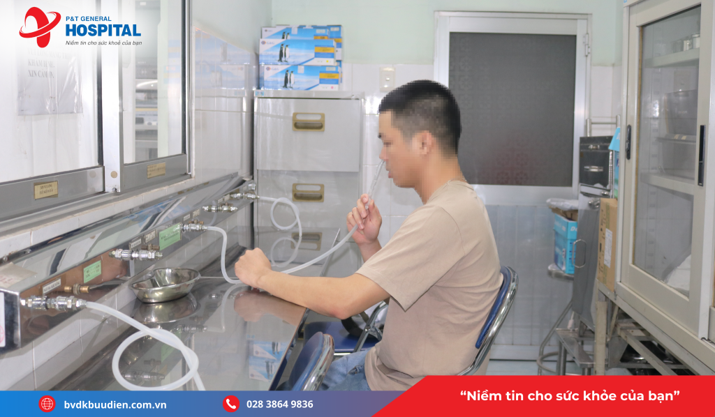 Bệnh nhân thực hiện phun khí dung tại Bệnh viện Đa khoa Bưu Điện