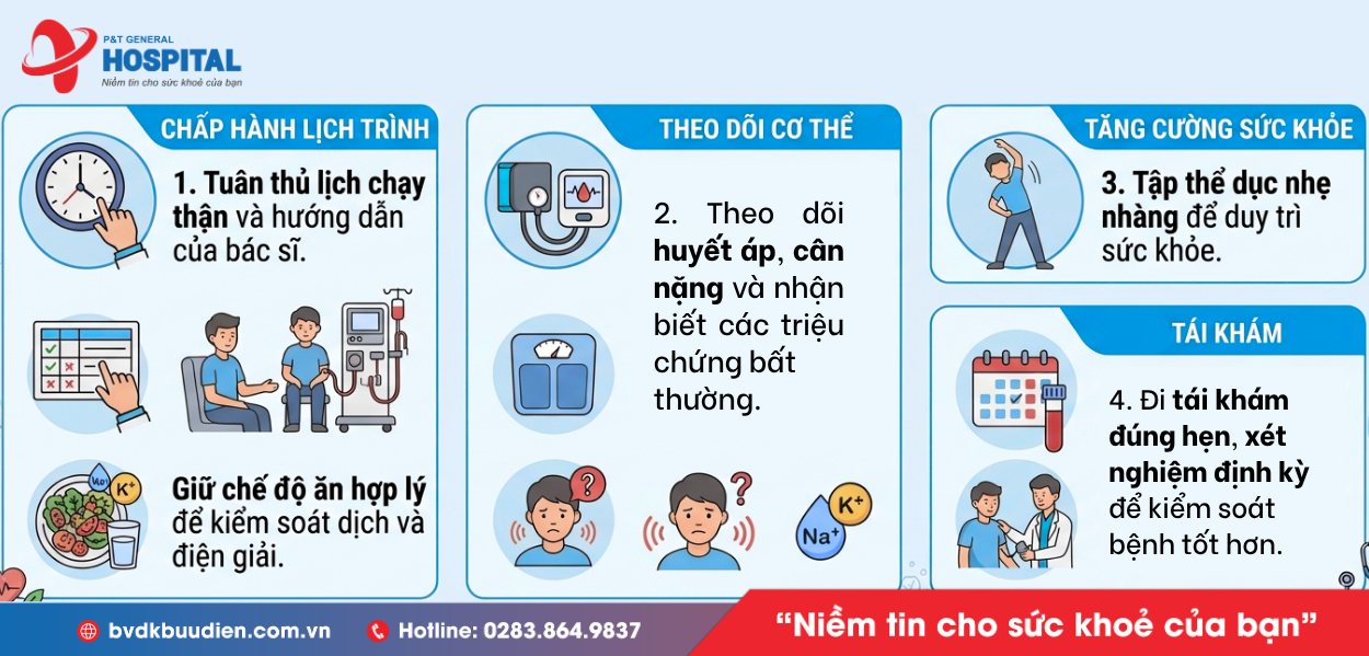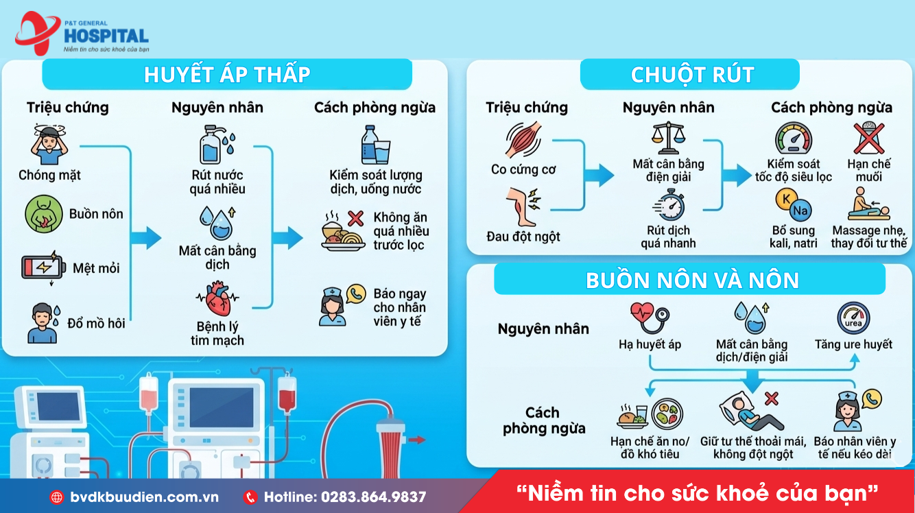 Cách phòng ngừa: Kiểm soát lượng dịch giữa các lần lọc máu, uống nước theo hướng dẫn; Không ăn quá nhiều trước khi chạy thận để tránh tụt huyết áp; Báo ngay cho nhân viên y tế nếu cảm thấy chóng mặt, khó chịu.